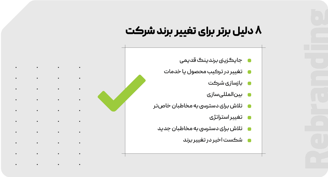 - بازار همیشه در حال تغییر است و برند نیاز به تطبیق با این تغییرات دارد. اما اگر این تغییرات به صورت گسترده باشد و دیگر نتوان با اصلاحات جزئی برند را با بازار منطبق نمود. ریبرندینگ راهکار مناسبی برای انطباق برند با بازار است.